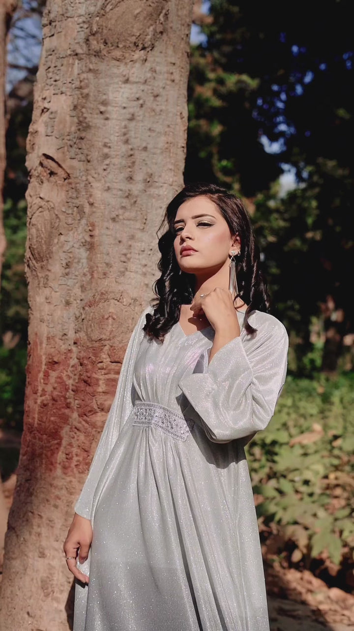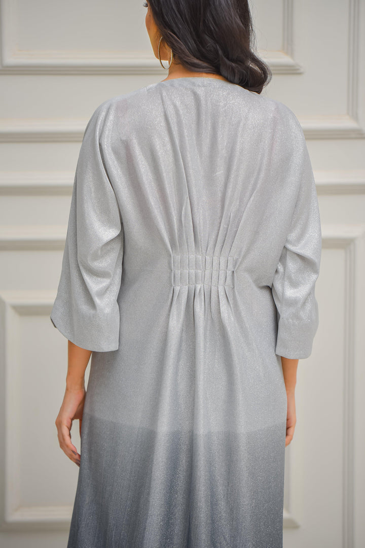 Step into elegance with light weight, summer friendly Celestial Ombre Kaftan — a shimmering silhouette that fades from radiant silver into deep charcoal grey. Designed to drape beautifully, this statement piece features gentle pleats, wide sleeves, and a subtly embellished waistband. Whether you're attending an evening gathering or celebrating under the stars, this kaftan delivers effortless glam with every step.