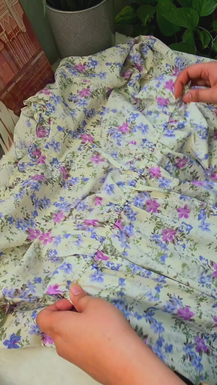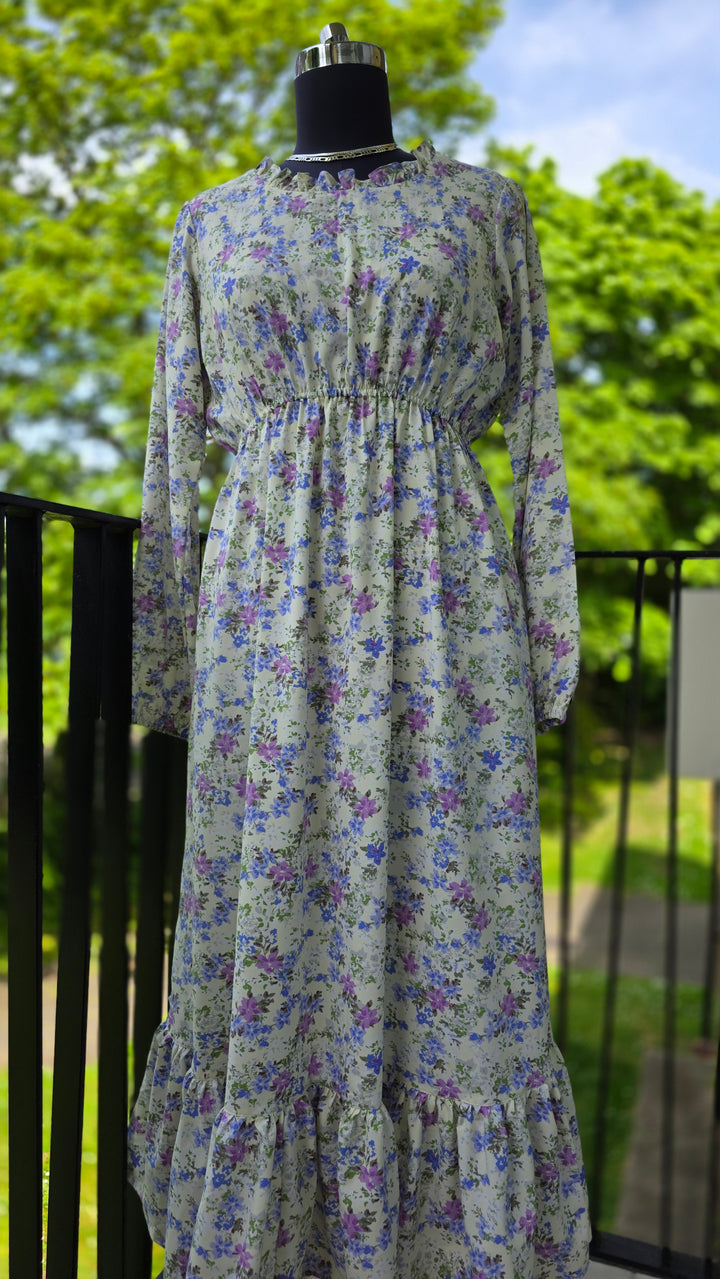 A romantic full-length dress featuring a delicate lavender and blue floral print on a soft neutral base. Designed with a gently gathered high waistline to offer a flattering silhouette and finished with subtle frill details along the neckline and hem.