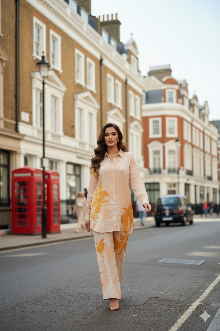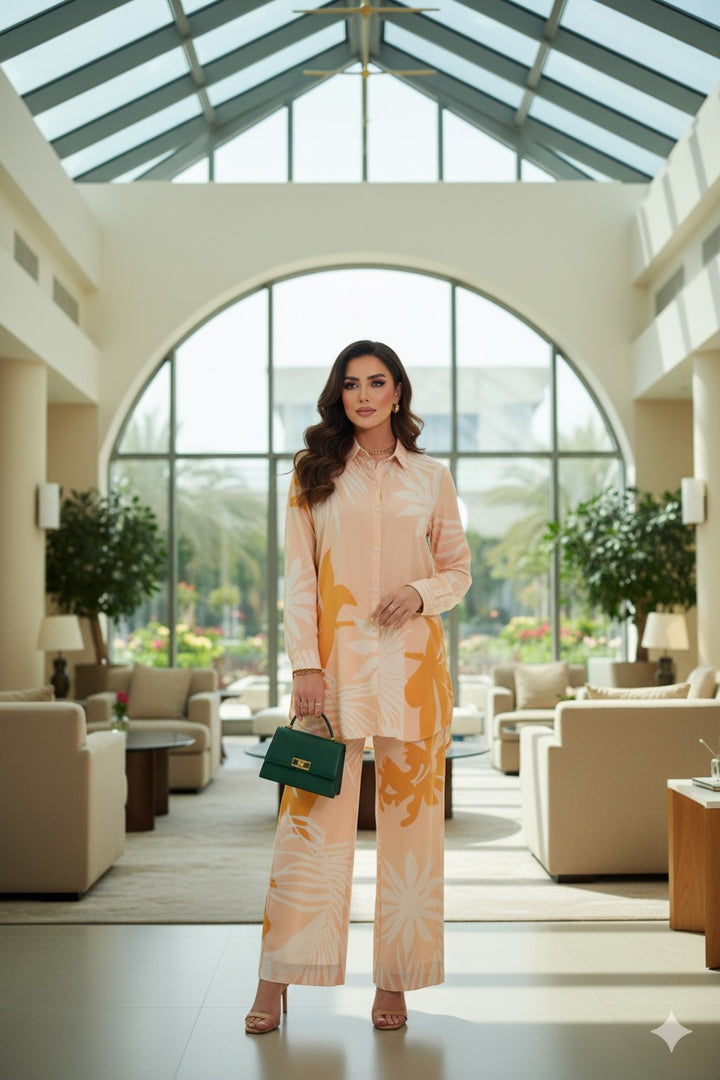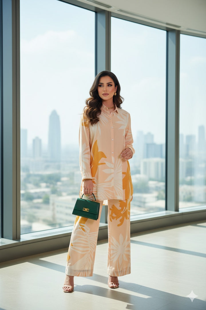A refined printed cord set designed for a clean, effortless look. The soft peach tones paired with the Palm pattern create a polished style that works in any setting. The long shirt and straight trousers offer a relaxed, modest fit that stays comfortable through the day. A versatile two piece you can wear anywhere, anytime.